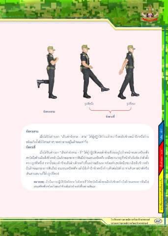 เมื่อได้ยินค าบอก “เดินท าจังหวะ - สาม” ให้ผู้ปฏิบัติก้าวเท้าขวาวิ่งต่อไปข้างหน้าอกหนึ่งก้าว “เดิน -