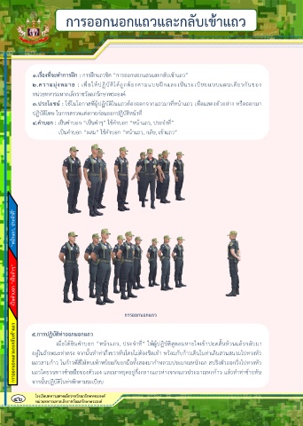 การออกนอกแถวและกลับเข้าแถว อยู่ในลักษณะท่าตรง จากนั้นท าท่ากึ่งขวาหันโดยไม่ต้องชิดเท้า พร้อมกับก้าวเดินในท่าเดินสวนสนามไปทางหัว
